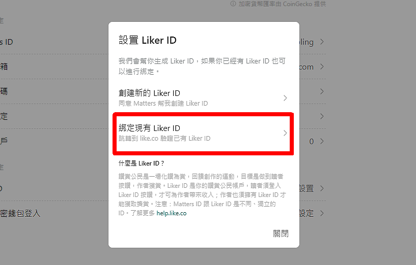 <figure><img src="https://887379602-files.gitbook.io/~/files/v0/b/gitbook-x-prod.appspot.com/o/spaces%2F-LL4mdaVjNgL6A1--PV0-1995411665%2Fuploads%2FKfL8TmfmOztBPDKg0yGe%2Fmatters%202.png?alt=media&#x26;token=b23cdb0d-3890-485c-84c7-4332cec43a86" alt=""><figcaption><p>點「綁定現有 Liker ID」</p></figcaption></figure>