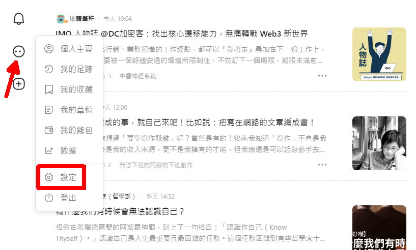 <figure><img src="https://887379602-files.gitbook.io/~/files/v0/b/gitbook-x-prod.appspot.com/o/spaces%2F-LL4mdaVjNgL6A1--PV0-1995411665%2Fuploads%2FMk2MpSUUdgWtrJ4bqFbS%2Fmatters%205.png?alt=media&#x26;token=31083a97-fac0-4db8-bd71-a8d797c82e4a" alt=""><figcaption><p>點「我的」，再點設定</p></figcaption></figure>